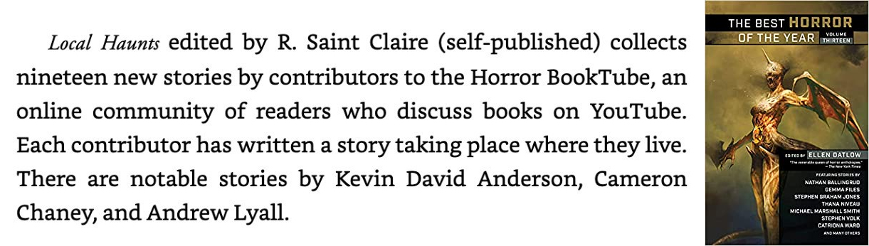NICE PAT ON THE BACKAs mentioned above, I got a nice shout-out in Ellen Datlow's The Best Horror of the Year Volume 13, for my short story contribution to the charity anthology, Local Haunts.